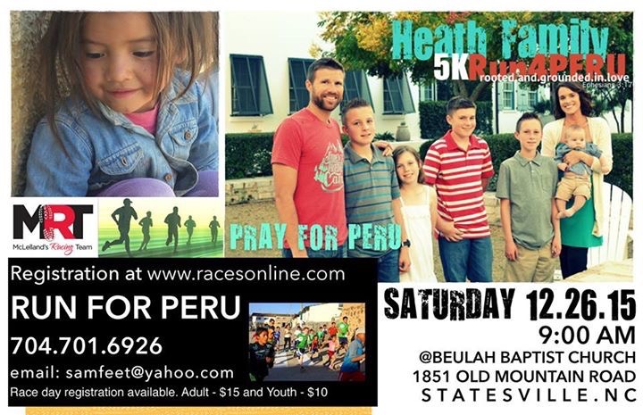 Thank you so much for all the love and support given this morning for the MRT 5K Run For Peru…it was so great seeing everyone early this morning on this BEAUTIFUL day! We are so proud of the runners, the personal records that were achieved, and for our church family (Beulah Baptist Church) for helping to host this event! We really do appreciate MRT Racing & Scott McLelland for this third annual event! Thank you, Scott, for all the hard work that your team put in! Thank you Joey Gilleland for the support! Lord willing, we look forward to seeing you all again next year on December 31, 2016 (the last day in the year 2016) for this race to help support the mission work in Peru. Mark your calendars!!! Also, a BIG Thank you to Lou Ann Dyson, Terry & Cherilyn Davis, Alarie & Chris Stone, Tonya & Kevin Sherrill, Joan Forsyth, Christy Strange for all your help with today’s event!